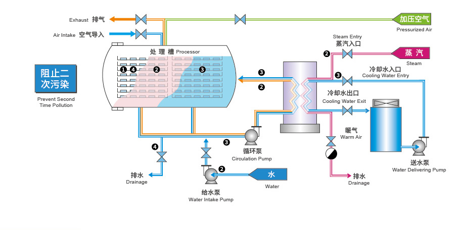 ? 間接加熱間接冷卻,冷卻用水與工藝用水不接觸,避免了食品的二次污染,無需使用水處理化學制劑,高溫短時間殺菌。