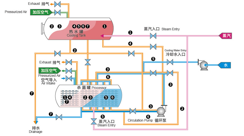 ? 殺菌結(jié)束后的熱水回收至上罐,節(jié)約蒸汽、能耗和殺菌時間。